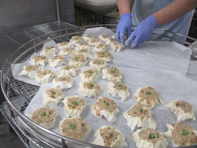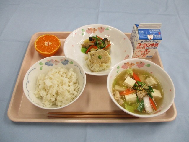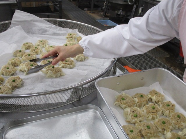 豚ひき肉に野菜と大豆のみじん切りを混ぜてタネとし、シュウマイを作りました。大きな釜で蒸していると、冷え切った給食室に湯気が上がってほっとします。冷暖房の無い給食室は、暑い夏もつらいですが、寒い冬もつらいです。美味しく食べてくれるみんなの顔を思い浮かべながら、頑張っています。
