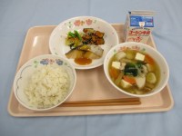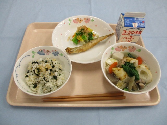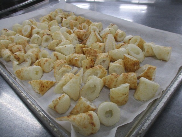 鶏ガラでとった汁に鶏肉や野菜ときりたんぽを入れた鍋料理がきりたんぽ鍋です。残りご飯を潰して棒に刺して焼いたものを鶏鍋に入れたことが始まりと伝えられています。きりたんぽは長いものを6等分に切り、オーブンでもう一度焼いてからスープの中に入れました。周りを焼いて固くしておくと汁の中に入れても溶けにくくなります。家庭で鍋料理にきりたんぽを入れる時も、食べやすい大きさに切ってからオーブントースターで焼いておくと煮崩れせず、最後までおいしく食べられますので、やってみてください。