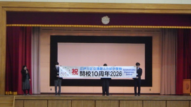 この横断幕には、児童から応募のあったキャラクター「ふたわちゃん」が描かれており、10周年を彩るシンボルとなっています。