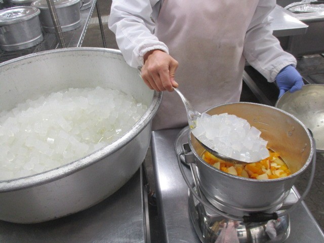 缶詰のフルーツに生のりんごと寒天を混ぜてポンチを作りました。生のフルーツが入ると食感も変わり、りんごの皮の赤い色が目にもおいしくなりました。