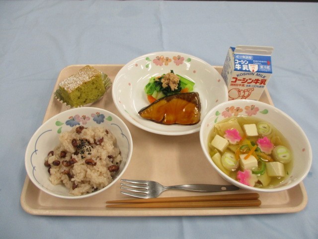 ささげ豆ともち米100%でお赤飯を作りました。最近ではお赤飯も炊けるような炊飯器もあり、もち米を「ふかす(蒸す)」ということは少なくなってきているかと思います。本来の赤飯の味を最後に伝え、令和7年度の給食提供は無事終了することができました。今年度も本校の給食、食育の取り組みにご理解、ご協力をいただきありがとうございました。