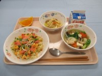 鶏むね肉に片栗粉をつけて油で揚げ、キャベツと一緒にパンに挟みました。挟んだ後に釜で蒸し、教室に届けました。スープにはみんなの好きなパスタが入り、じゃが芋はたっぷりのにんにくで炒め、香り豊かにいただきました。