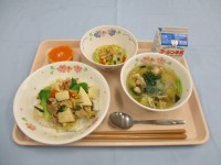 昨日とは打って変わり、今日は洋食でした。「わ~ハンバーグだ~!」と、喜んでいる子がいましたよ、と教室を回っていた校長先生から教えていただきました。ふたば小の給食のひき肉料理には、畑の肉と言われている大豆のみじん切りがいつも混ぜられており、豆の栄養を無意識に摂取できるようになっています。肉の量が少なくてもボリュームが出て、食べ応えがあるのにヘルシーです。定規の代わりに調理場にある道具を使って、みんな同じ大きさになるように気を配りながら切り分けていきます。ご飯のにんにくは材料の一部を薄く切って油で炒め揚げして、ご飯の上にトッピングしました。