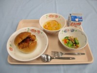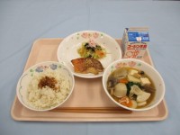 昨日とは打って変わり、今日は洋食でした。「わ~ハンバーグだ~!」と、喜んでいる子がいましたよ、と教室を回っていた校長先生から教えていただきました。ふたば小の給食のひき肉料理には、畑の肉と言われている大豆のみじん切りがいつも混ぜられており、豆の栄養を無意識に摂取できるようになっています。肉の量が少なくてもボリュームが出て、食べ応えがあるのにヘルシーです。定規の代わりに調理場にある道具を使って、みんな同じ大きさになるように気を配りながら切り分けていきます。ご飯のにんにくは材料の一部を薄く切って油で炒め揚げして、ご飯の上にトッピングしました。