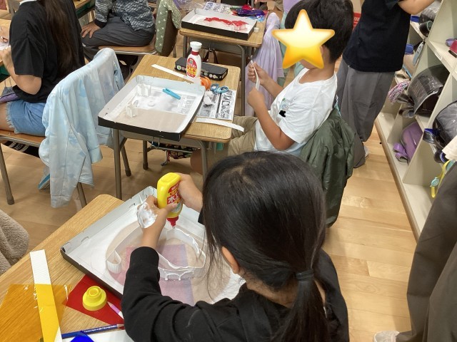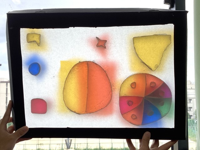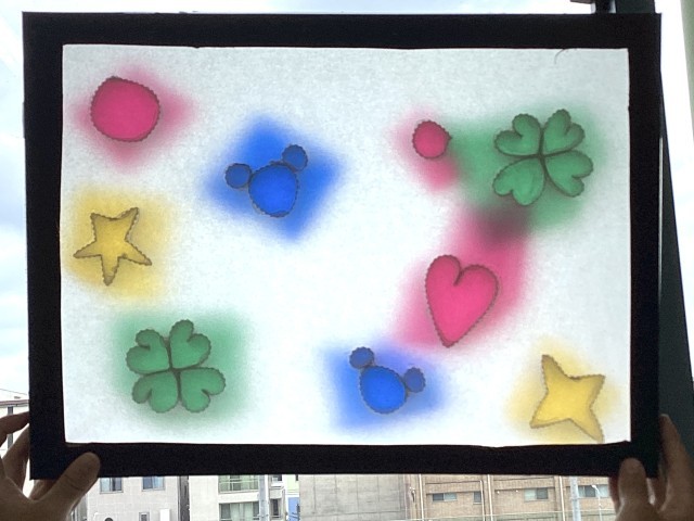 3年生の図工では、『光サンドイッチ』の学習を行いました。カッターを使って枠を切り出し、自分で好きな模様をウェーブ用紙で形どったところに、セロファンを貼り付けました。光に透かして見てみると、きれいに色が透けて見え、友達の作品を見合って透けた様子を楽しみました。