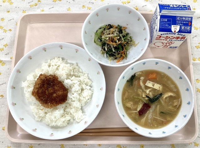 今日は、明日の体育大会に出場する6年生のみなさんへの応援給食です。勝負に勝つにかけてソースチキン“勝つ“どんを作りました。