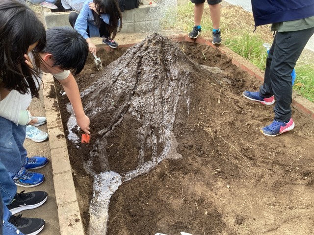 どのクラスでも、砂山を作り、その上から雨を降らせ、川を流しました。
