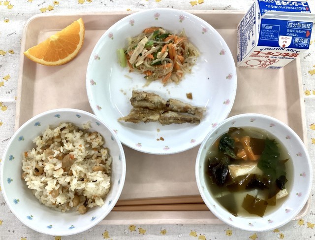 今日は、このニギスを揚げて、長ネギやしょうがなとの香味野菜、ごま油などを使ったユーリンチーのタレを絡めていただきました。骨までまるごと食べられるように、カリカリに揚げてもらいました。子供たちは、「良く噛んで食べるんだよ」とお友達同士で声をかけながら食べていました。