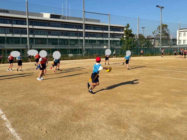 4年生の体育では、体育館でソフトバレーボールを、第2校庭でタグラグビーに取り組んでいます。