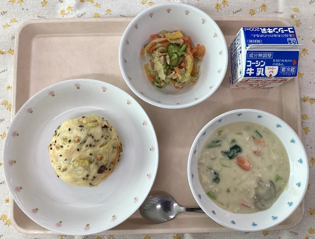 今日は、給食室で粉から手作りしたさつまいもの丸パンを食べました。