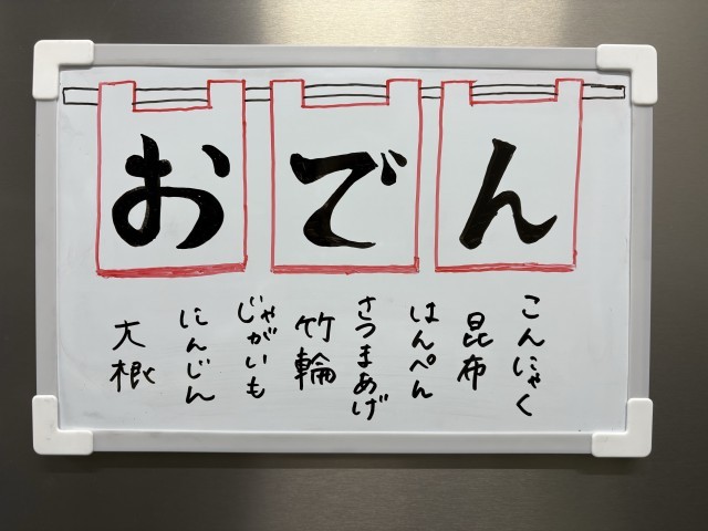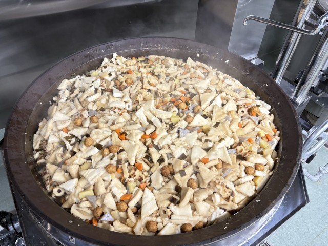 給食では、こんにゃく、昆布、はんぺん、さつま揚げ、竹輪、じゃがいも、人参、大根の8種類の具材を入れました。鰹節でダシをとり、醤油、三温糖、塩、みりんを加えて味をつけ、弱火で煮込んだ後、一旦火を止めて食材に味を染み込ませました。たくさんの食材からでた旨味が染み込み、美味しく仕上がりました。
