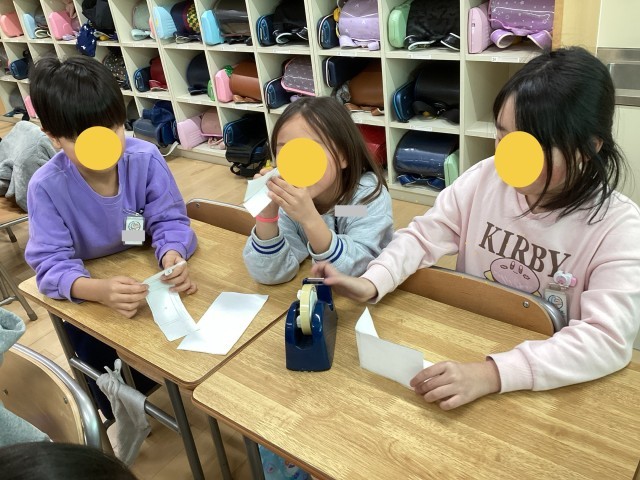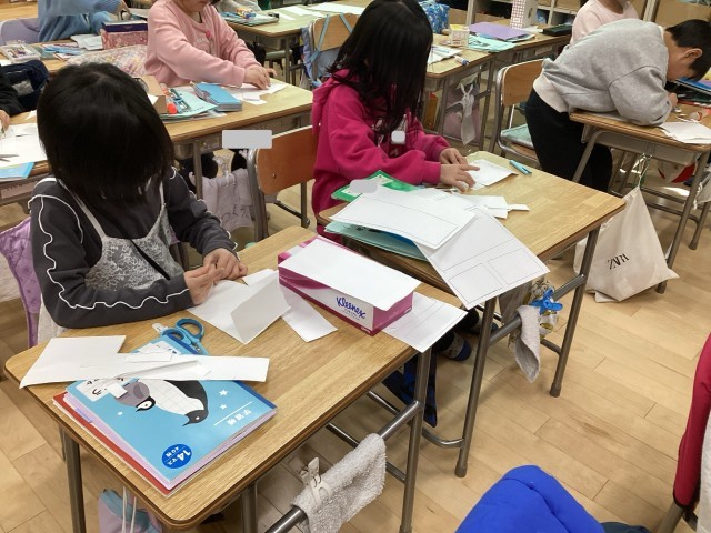 昨日はお菓子などの箱を紙に写してはさみで切って面を作り、今日は6つの面をテープでつないで箱にしました。