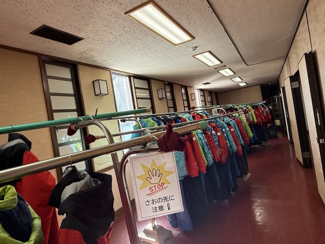 昼食後はスノーウェア合わせです。ウェア上下の着方を実演で学び、サイズをチェックします。