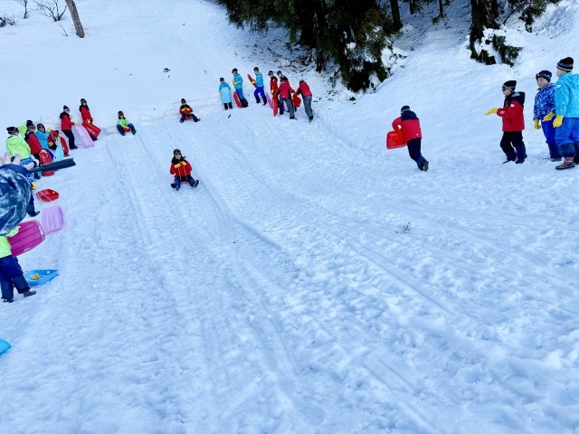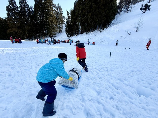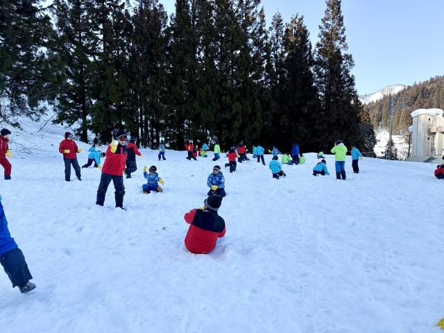 クラス対抗雪上リレーでそれぞれのクラスの雪だるまマスコットをそりに乗せて運んだり、そりすべりや雪合戦、雪の彫刻づくりなどなど…