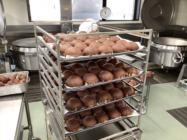 ココアビスキュイパンは、小麦粉、たまご、ココア、さとう、マーガリンを合わせたビスキュイ生地を丸パンの表面にぬって焼き上げたパンです。今回は、パンの切り込みの部分にマーマレードジャムをぬって挟んでいます。ビスキュイ生地は、焼くとサクッとしたクッキーのような食感に仕上がります。濃厚なココア風味とマーマレードジャムのさわやかさがよくあって、子供たちにも大好評でした。