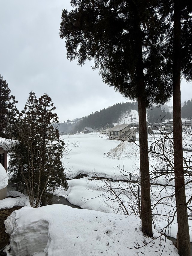 二日目の朝です。昨日夜から雨が降り始め、雨は夜更け過ぎに雪へと変わるかと期待していたのですが、曇り。それでも空も山も地面も空気もほとんど真っ白。昨日とはまた違った雪国の世界が広がっています。