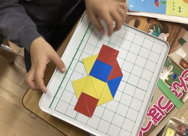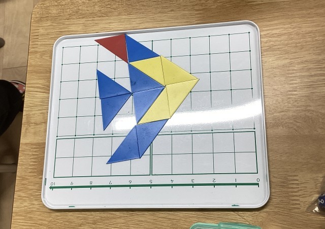 1年生の算数は、最後の単元が始まりました。三角形を使って形を作ったり、棒で四角形や三角形を作ったりする図形の学習です。「車が作れたよ。」「魚の形になった!」とクラスの仲間と協力して様々な形を作っていました。
