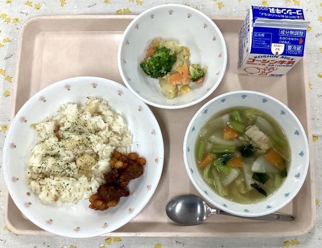 イカとエビ、ツナと玉ねぎをバターでよく炒めます。具材を炒めた時に出た煮汁を使ってお米を炊くことで、バターと魚介のうま味がぎゅっと詰まったご飯が炊きあがります。メインのおかずは、レバーとポテトのマリアナソースでした。揚げたケチャップとウスターソースで作ったソースを絡めるので、こちらの味付けをしっかり目にして、ご飯は少し薄めに味をつけました。給食室に帰ってきた食缶は、ほとんどのクラスが空っぽ。子供たちもおいしく食べることができたようです。