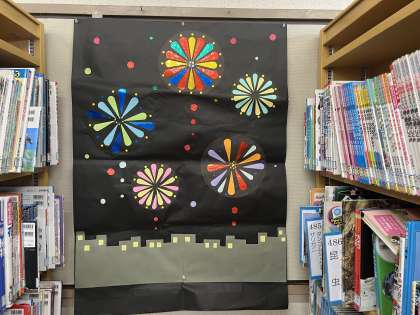 7月の装飾は、鮮やかな花火やゆらゆらと揺れて涼しい風鈴、夏らしいひまわりです。