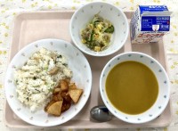 今日のメニュー ハムとサツマイモのピラフ レバーのケチャップソース和え コールス...
