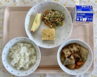 今日のメニュー ごはん 里芋コロッケ 小松菜とツナの甘酢あえ 豆腐とわかめの味噌...