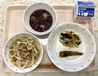 今日のメニューけんちんうどん牛乳メヒカリの磯辺揚げほうれん草のおかか和え白玉汁粉...
