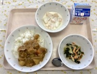 今日のメニュー ポークカレーライス こまツナサラダ フルーツヨーグルト 牛乳 今...