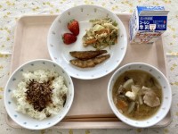 今日のメニューごはん牛乳鮭のさざれ焼きごぼうのカミカミ和え豆腐のかきたま汁甘夏み...