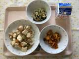 今日のメニュー ・豆腐と豚肉のあんかけ丼 ・牛乳 ・大豆とじゃこの揚げ煮 ・わ...