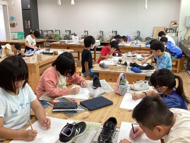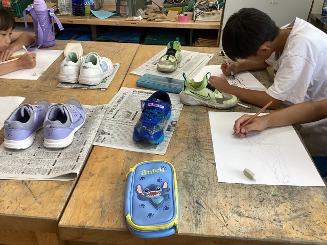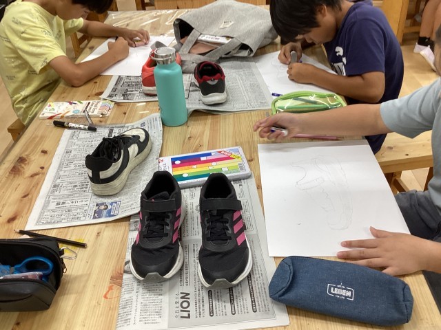 4年生の図工では、自分のくつをかいています。全体の形、模様、ひもはどうなっているかなどをよく見てデッサンをします。そのあとには色鉛筆で色を塗ります。くつそのものの色、汚れなどをよく見て色付けします。