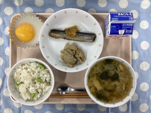 今日は十五夜にちなんで、季節の食材をたくさん使った献立にしました。全校的に秋刀魚の骨には苦戦していたようですが、6年生ともなると楽しんで骨を取っていたという感想もありました。さすが、6年生!!