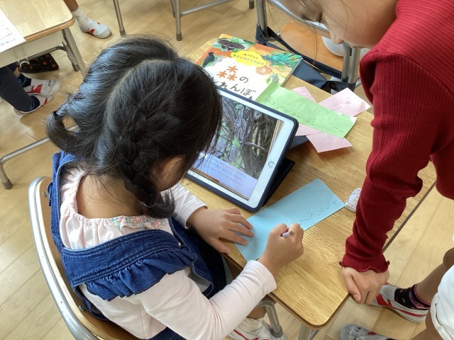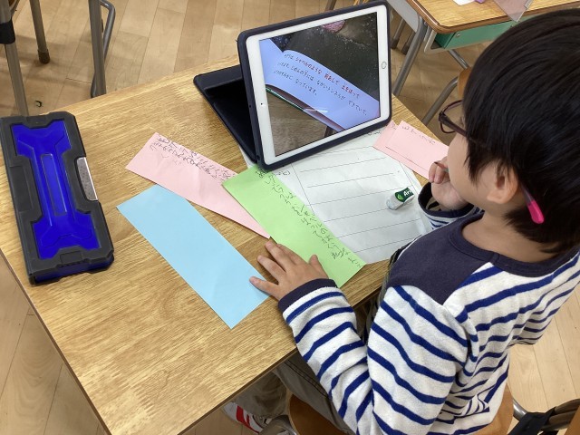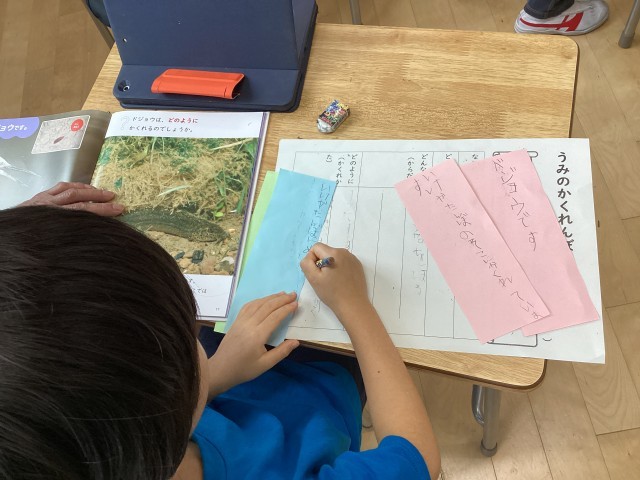 1年生は読書科「どうぶつについてしらべよう」の学習をしています。自分が選んだ生き物が、どこにどのようにしてかくれているのかを、本やタブレットで調べます。わかったことを色別の短冊に書き出し、これからまとめていきます。