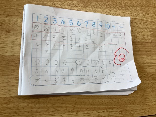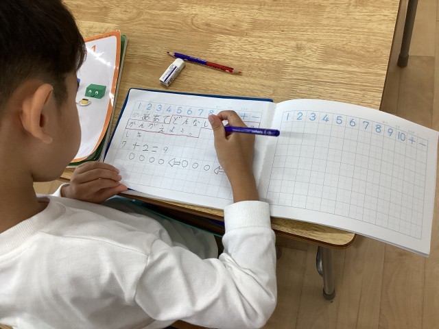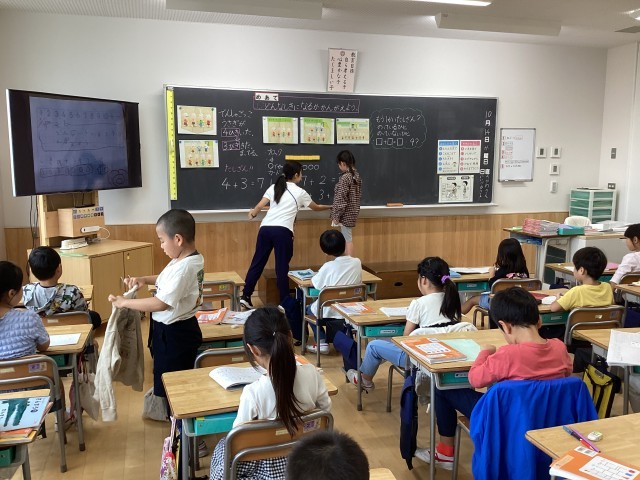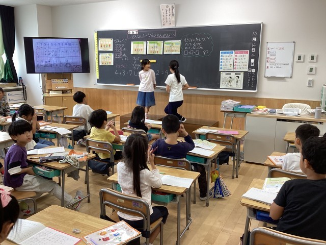 1年生の算数では、「3つのかずの たしざん ひきざん」の学習をしています。「4人が遊んでいるところに3人来て、その後から2人来ました。全部で何人になったでしょう。」という問題です。答えを出すにはどのような式を立てたらよいかを、まず自分1人で考えます。ブロックを使う子、○を書いて考える子などさまざまです。その後、考えを発表し、みんなで確かめました。