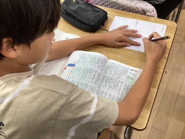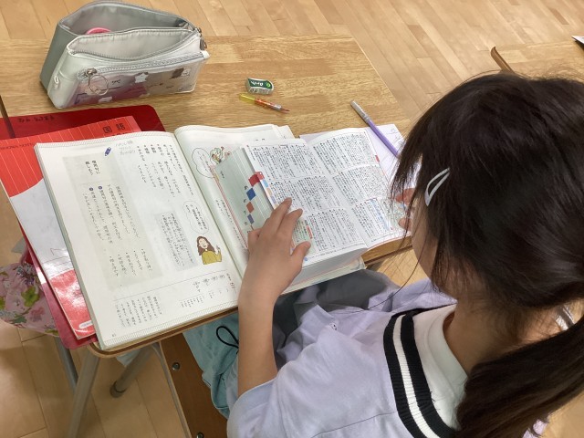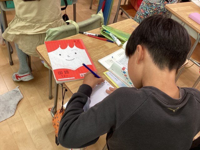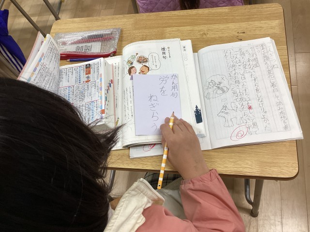 4年生の国語では慣用句の学習をしています。頭をひねる、借りてきた猫などについて辞書を使って調べました。他にはどのようなものがあるか、その他の慣用句についても辞書をめくりながら探しました。
