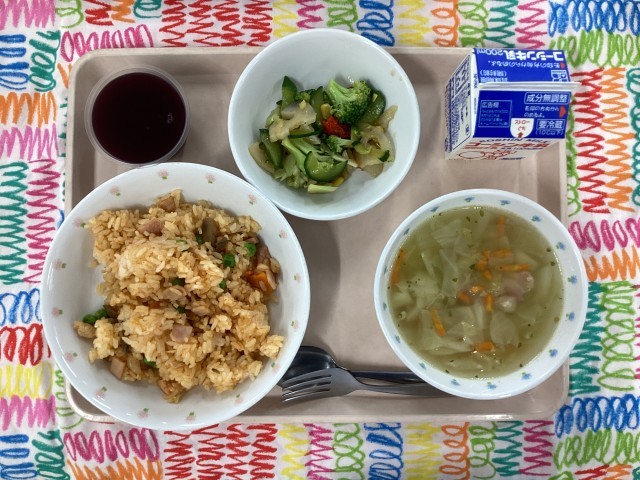 今日は10月のお誕生日給食でした。楽しみにしているデザートにはぶどう寒天を作りました。大きなぶどうを一粒入れて、ちょっとリッチに仕上がりました。