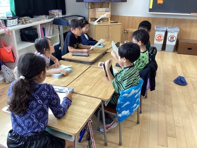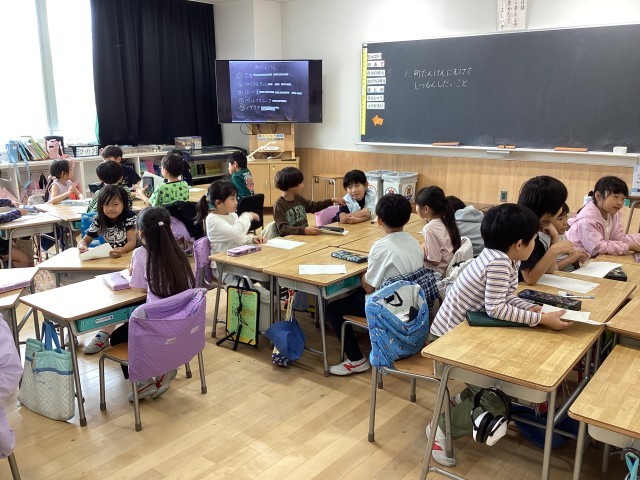 2年生の生活科ではまちたんけんを予定しています。グループごとに、交番、郵便局、保育園、ペットクリニックなどを訪問します。その時に聞きたいこと、質問を考え、グループごとに内容の確認をしました。