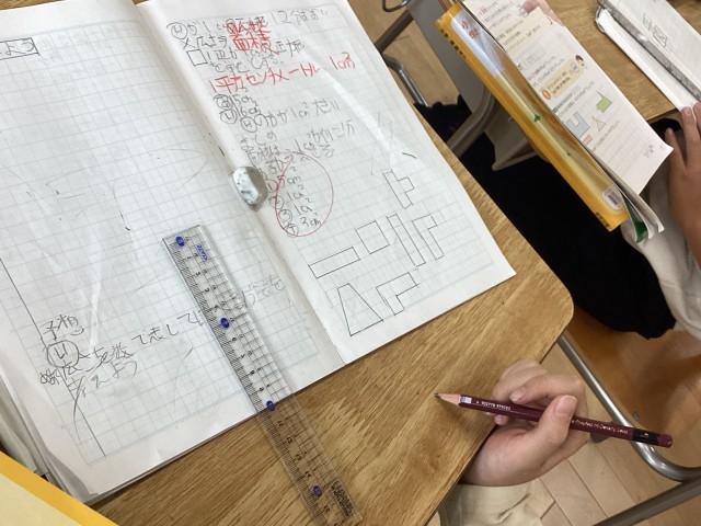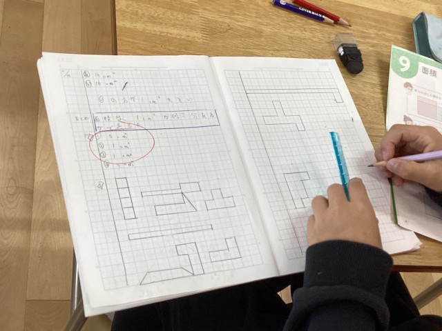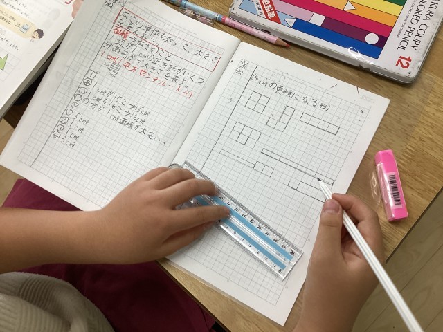 4年生の算数では、面積の学習をしています。面積とは広さのこと、1cm×1cmの正方形を1㎠(平方センチメートル)ということなどを学びました。その後、4㎠になるいろいろな形の図形、16㎠になるいろいろな形の図形を考えました。