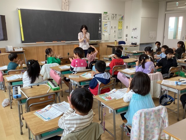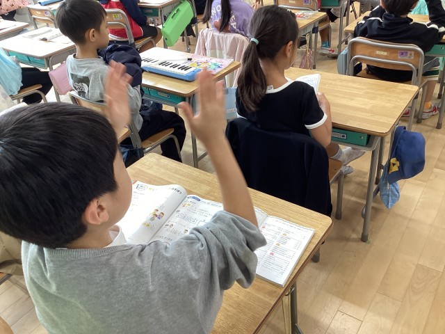 1年生の音楽では、「たん と たた のリズムであそぼう」の学習をしています。教員が打ったリズムと同じリズムを打つ「まねっこ遊び」、逆に教員や代表の子が打ったリズムと異なるリズムを打つ「よびかけっこ遊び」などで遊びました。