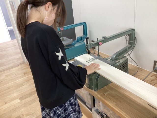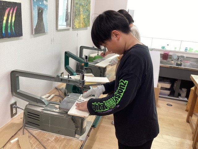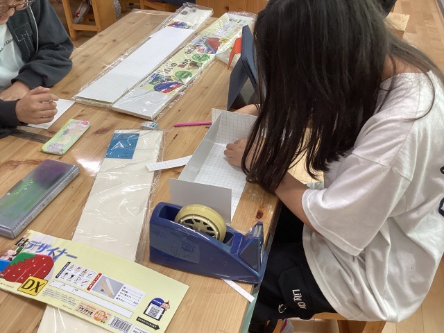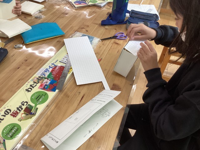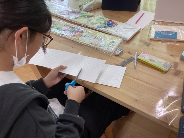 6年生の図工では「一枚の板から」の学習をしています。まず、できあがりのイメージ図を描き、そのパーツを板にどう配置したらよいのかを考えました。これを板と同じ大きさの方眼紙に描いてみて、組み立てます。これができれば実際に板を切ります。まずイメージ図からそのパーツを方眼紙に落とし込むところが難関です。図工の教員と共に相談しながら取り組んでいました。