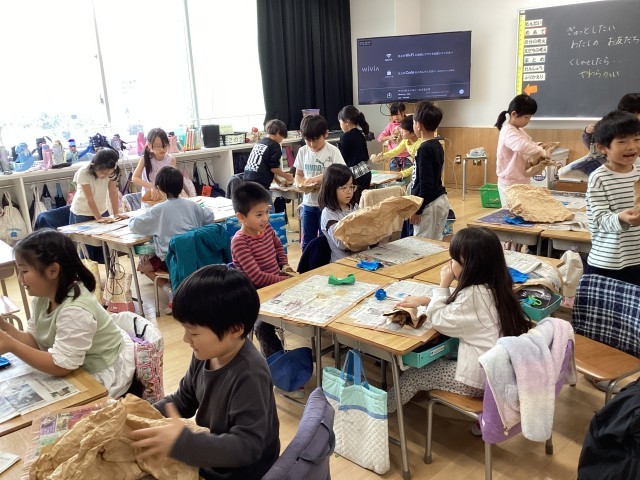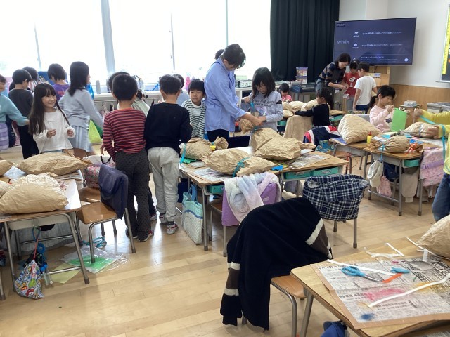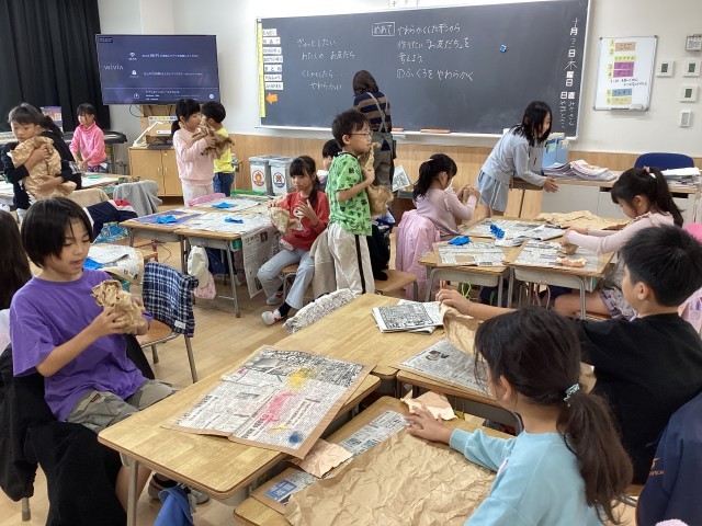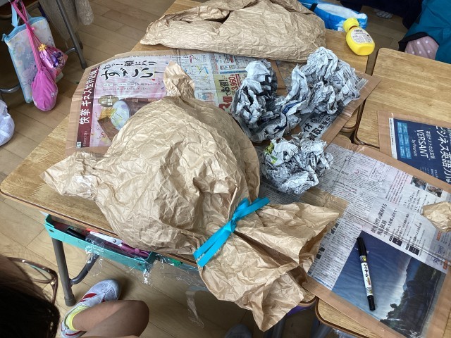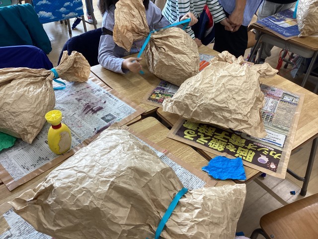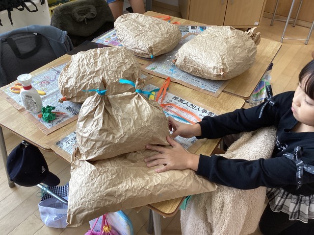 2年生の図工では「ぎゅっとしたい わたしの お友だち」の学習をしています。茶色の大きな袋を柔らかくなるまでくしゃくしゃにし、中に丸めた新聞紙を詰めました。ところどころをリボンやセロハンテープでギュッと絞り、形作りました。これから飾りをつけていきます。