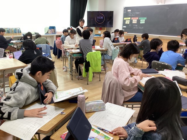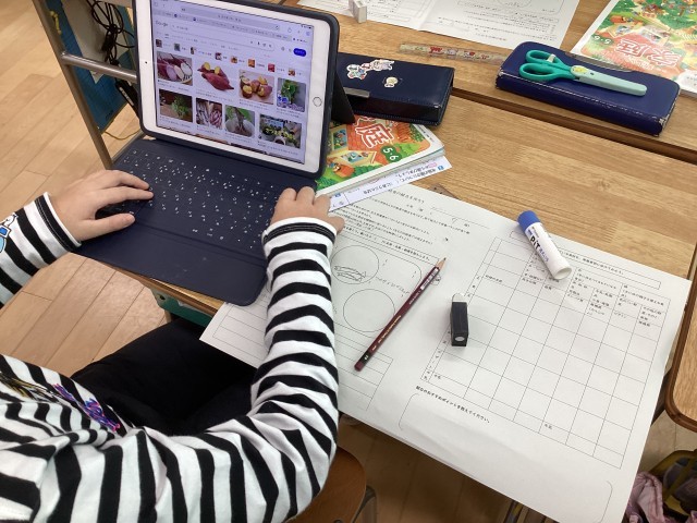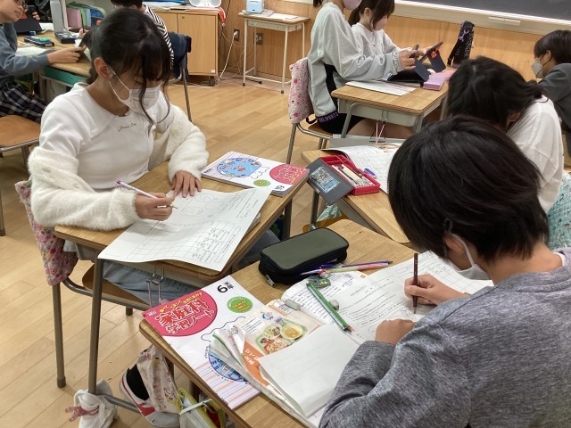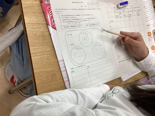 6年生の家庭科では「まかせてね 今日の食事」の学習をしています。栄養士からバランスのよい食事について学んだ後、「栄養のバランスを意識して、給食の献立を考えよう」というめあてのもと、献立を考えてみました。たんぱく質を摂るには何を使えばいいのか、季節の食材は何を入れるかなど考えていました。デザートなしのグループは「揚げパンが甘いので、デザートはなしにしました。」といっていました。これはよくできているという献立は、実際の給食に使われるということです。