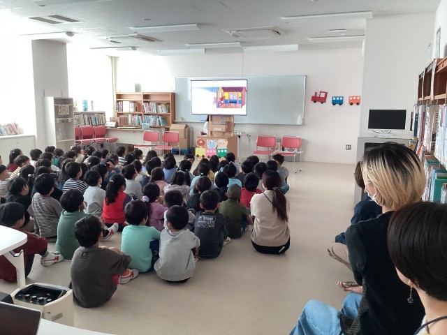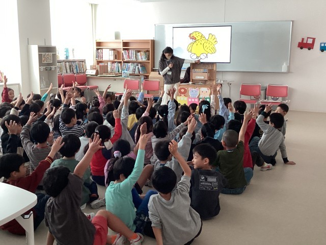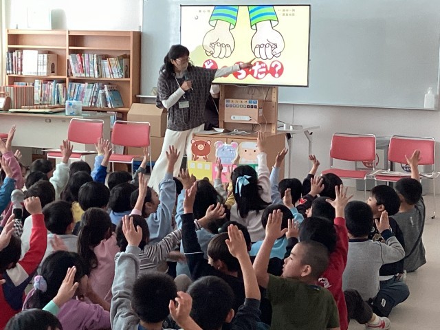 図書ボランティアによる1年生へのお話会が行われました。「しんせつなともだち」「しりとりのだいすきなおうさま」などの絵本の読み聞かせをしていただきました。「どっちだ?」という絵本の時は、「手の中に入っているのは、ど〜っちだ?」と子ども達への問いかけがありました。子ども達は「あっち!」「こっち!」といいながら楽しく見入っていました。多くのボランティアの方々のおかげで、楽しいひと時になりました。