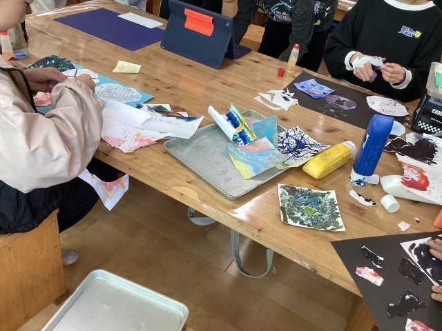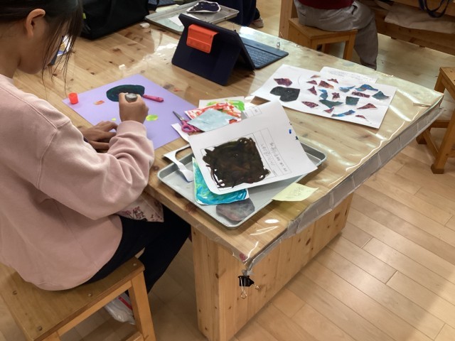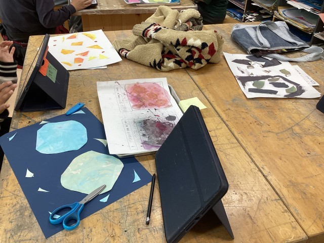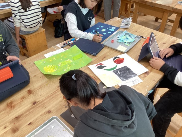 5年生の図工では、「心のもよう」を作成しています。自分の気持ちや思い、心を表現するという学習です。ある子は「希望をとりもどす」という題をつけていました。「白い部分が希望を表していて、暗いところから出てきたところだ。」と話してくれました。みんな自分の心と向き合いながら制作しています。このあとはタブレットを使って作品の発表会・鑑賞会をしました。