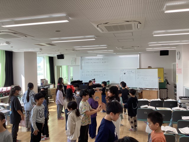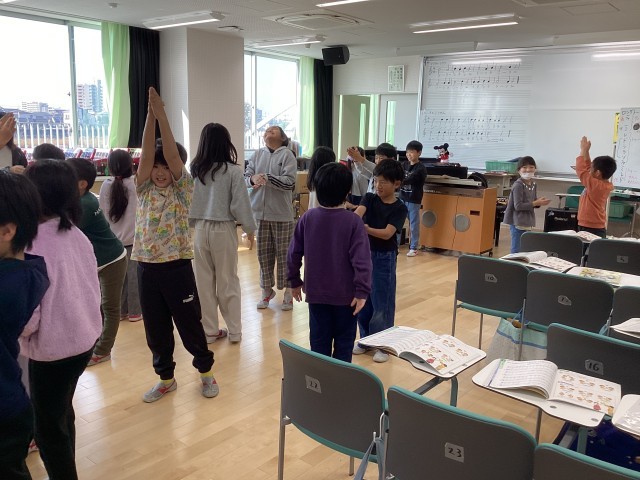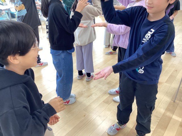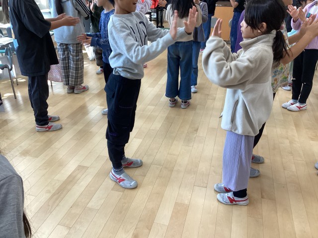3年生の音楽ではリズム遊びをしています。流れてくる曲に合わせ、手遊びをします。曲が変わるたびに今までやったことのない相手をみつけ、新しい手遊びを行いました。だれとでも関わって音楽を楽しめるようにと取り組んでいます。