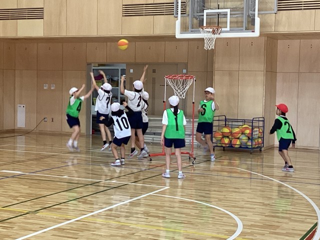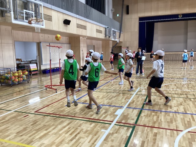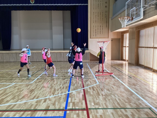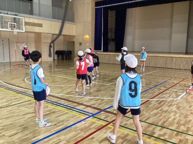 4年生はの体育ではセストボールに取り組んでいます。セストボールはバスケットボール型のゲームで、高さの低いゴールを使います。パスをしながらボールを運びシュートをします。味方と相手が入り混じって行うゲームで、よいところにいる味方を見つけたり、相手の邪魔をすることがなかなか難しいようでしたが、よいパスが通ったりシュートが決まったりすると、歓声が上がっていました。