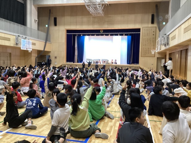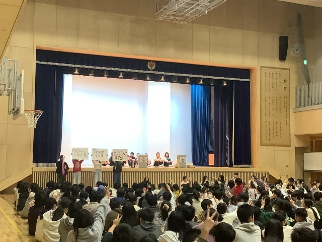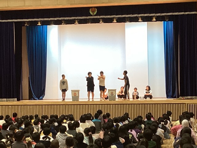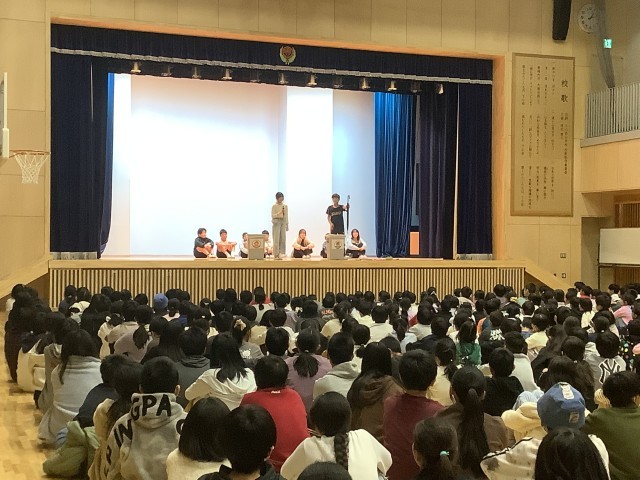 環境委員会の発表が行われました。ふだん環境委員会が行っている仕事について、ごみの出しかたについてなどの発表がありました。学校から出すごみの処理にはお金がかかっていることもあるので、ごみは燃やすごみ、燃やさないごみ、リサイクル紙にしっかりと分別しましょうということでした。そして、リサイクル紙にはどのようなものが出せるかということも知らせました。その後、クイズで確かめを行いました。