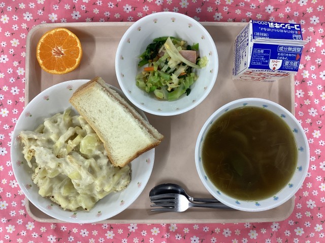 今日は6年1組2班さんが家庭科の授業で考えた献立です。献立のおすすめポイントは、栄養のバランスが良くなるように食材を考えたことと、江戸川区特産の小松菜を取り入れたことです。また、寒い時期なので、温かいものにした、ということです。グラタンはとても人気でした!