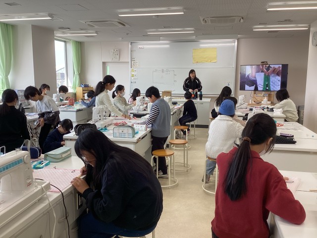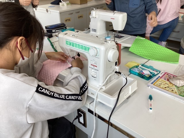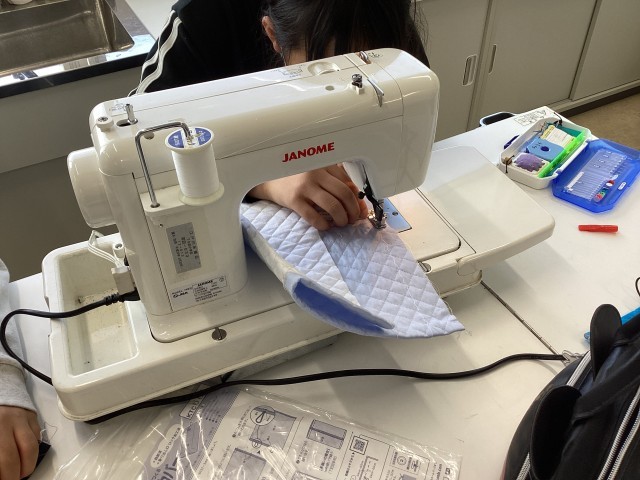 6年生はキルト生地でティッシュボックスのカバーを作っています。これまでまつり縫いを学び、ミシンを使って箱が入るように縫い進めていました。すてきなカバーができるとよいです。