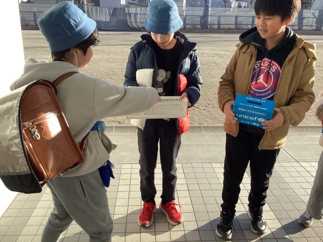 代表委員会児童は、今週3日間ユニセフ募金に取り組みました。登校時みんなが登校してくるのを迎え入れ、「ユニセフ募金 お願いします!!」と大きな声で呼びかけました。下小岩小学校一人一人の気持ちが、世界中の困っている子どもたちに届くとよいです。