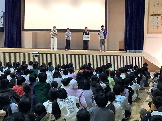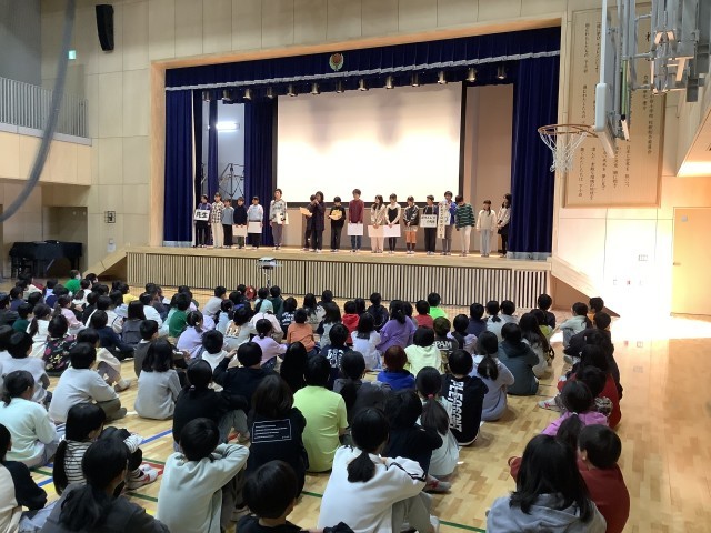 給食委員会の発表がありました。下小岩小学校の給食について子どもに、教員に、校長先生になど、好きな給食についてインタビューを行い、動画で発表しました。そしてしっかりと噛んで、残さず給食を食べようというメッセージを送りました。よく噛むことの効用の合言葉「ひみこのはがいーぜ」について発表しました。ひ:肥満を防止する み:味覚が発達する こ:言葉の発音がはっきりできるようになる の:脳が発達する は:歯の病気を予防する が:がんを予防する いー:胃腸の働きをよくする ぜ:全身の体力向上を図ることができる 「へぇ そんないいことがあるんだ・・・」などいう声も聞かれました。